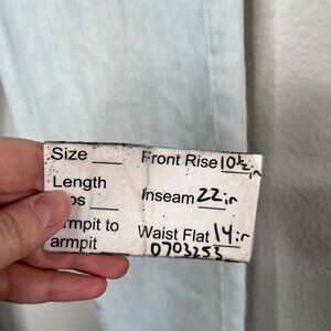 light mark on back pocket. Waist flat = 14 inches, Front rise = 10.5 inches, Inseam = 22 inches.
