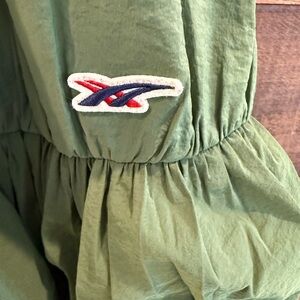Embrace the casual street vibe of this sleeveless sundress, featuring a vibrant green hue and a playful tiered design. The spaghetti straps and ruffled bubble hem add a touch of whimsy to a brand known for its urban theme. Its midi length and airy fabric ensure comfort and style for any laid-back occasion. The fabric is more of a ‘street’ vibe, water resistant type material. Very cool!