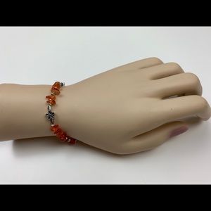 Made with orange beads which are uneven shapes along with metal charm beads.