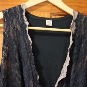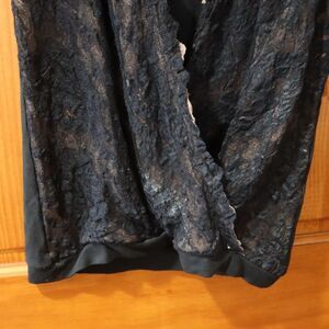 Only Hearts NYC is known for sophisticated, feminine designs that combine delicate detailing with versatile wearability. This black lace sleeveless blouse features a deep V neckline, nude lace trim, and a soft jersey back, creating a refined contrast that is both elegant and comfortable. Ideal for layering under blazers, cardigans, or tailored jackets, it elevates professional or evening outfits with a subtle romantic touch. Lightweight and flattering, this blouse offers effortless style for both day and night, adding a polished, chic accent to any wardrobe. A refined piece that balances elegance and versatility.