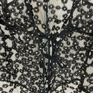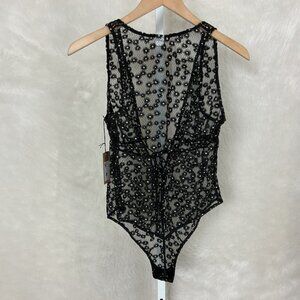 This is a sleeveless, sheer, black lace metallic gold & black embroidery, tie front bodysuit from Only Hearts NYC. NWT, bnwt, brand new with tags. No flaws. For reference the mannequin is a size 6-8 with measurements of: 34 in 26 in 35 in.