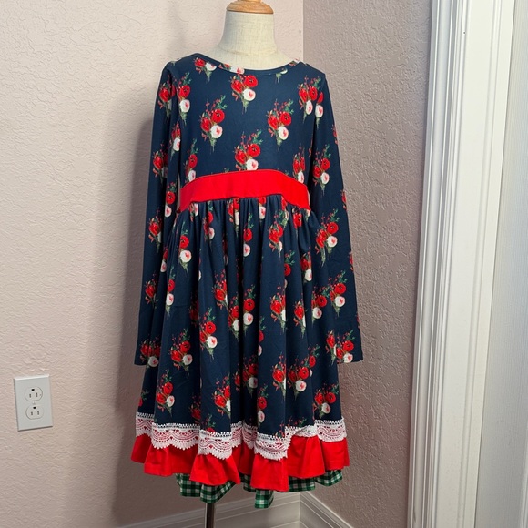 Charming floral dress with long sleeves. Features vibrant red accents and lace trim. Size 12Y runs true. Soft cotton and heavy skirt. Worn once for photos.