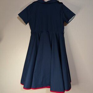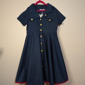 Keywords: Only Little Once, Military Inspired, Navy Blue, Blue Dress, Girls Dress, Kids Dress, Fit and Flare, Collared, Gold Buttons, Button Accents, Knee Length, Special Occasion, Party Dress, Casual Dress, Dress Up, Uniform Style, Polyester, School Dress, Spring, Summer, Fall, Winter, Machine Washable, Scalloped Trim, Dressy.