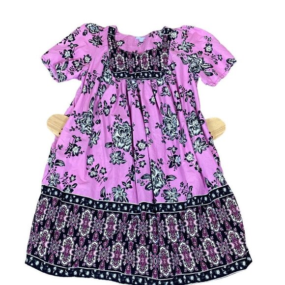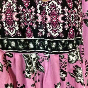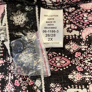This beautiful Only Necessities cotton kaftan muumuu dress is perfect for any casual or travel occasion. The dress features a gorgeous floral pattern in pink, black, gray and white with a sweetheart neckline and short sleeves. It has a button closure with a midi length. The dress is machine washable and made in India, with a lightweight feel and pockets for added convenience. It's available in size 2X and is perfect for plus-sized women. The dress is ideal for summer, fall, or spring, and its shift, kaftan, and overall dress style makes it a versatile addition to any wardrobe.