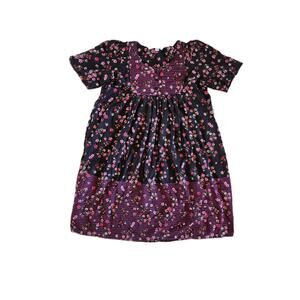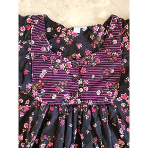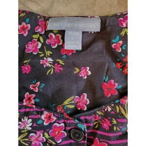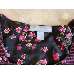 This is an Only Necessities women's black floral lounger house dress. The dress is black with a contrasting floral print that features stripes and a 3 button top for accents. It is short sleeve and super lightweight and breathable. The fabric is soft and flowy. There are no flaws despite the item being used. It is slip on style.
