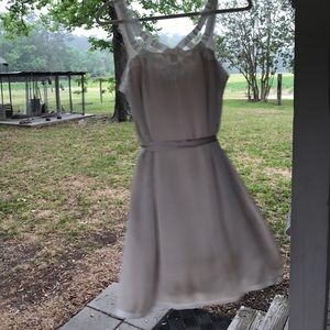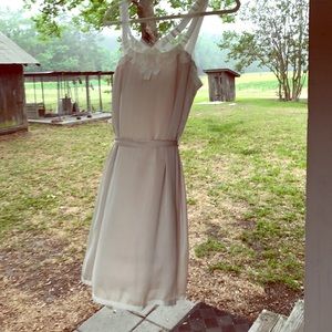 Beautiful Ya Los Angela's champagne silk dress with tie at the waists. Cream top pattern. Very flattering on! Only worn to a formal event once!