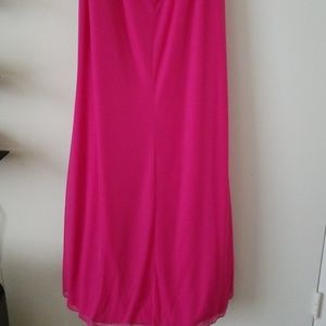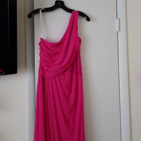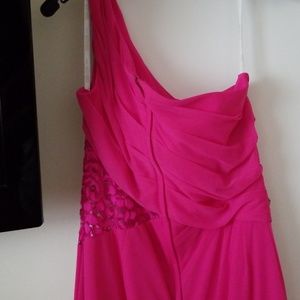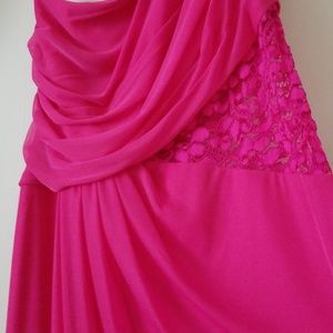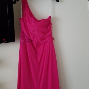 Fuchsia pink long wedding/evening dress with lace siding and single strap.