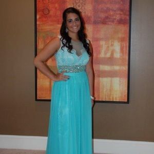 Beautiful hand made light blue prom dress with lace on top and shear beaded section in middle. Has bra support, floor length
