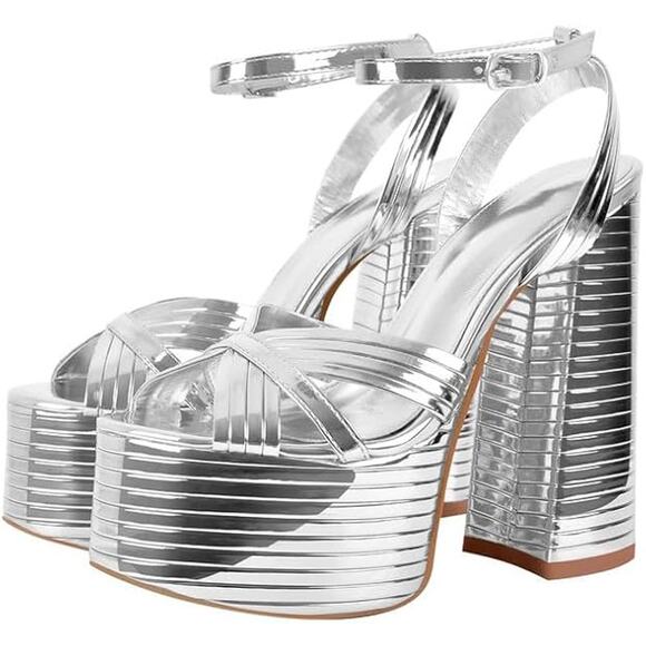 Onlymaker Womens Size 8 Shiny Silver 6" Platform Heels Open Ankle Strap Shoes