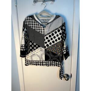 Onque Blouse Medium Black White Side Tie 3/4 Sleeve Geometric 80s 90s Funky