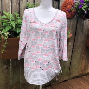 Cute Cute Cute Onque Casual Flamingo T Shirt. Scoop Neckline. Pink and Gray Stripes with White Fabric. Sequin Detail on some Flamingos. 3/4 Sleeves. Size Large. Draw String Tie on one Side. Perfect for your next Pool Party or just to Perk up any old day! Great Pre-Loved Condition. Worn 1 Time. Approximate Measurements taken laying flat.