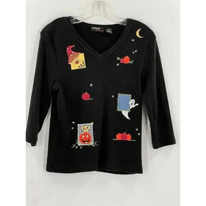 Onque Casual Top Halloween Embroidered Blouse Cat Ghost Pumpkins Easy Wear SMALL