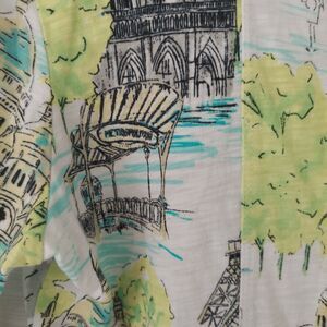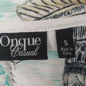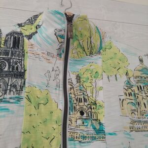 Onque Casual - Womens Super Cute Zip Top Size Small Jacket Street Scene Graphics in Blue and Green 3/4 sleeves, 2 front pockets Colorful and fun Great for an active lifestyle.