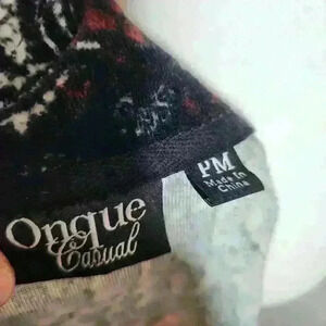 Onque Casual women's soft terry zip up lightweight jacket size petite medium. Red and black Paisley print. In excellent pre-owned condition. No flaws. Measurements are approximate and taken flat.