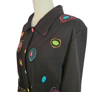 This black cardigan jacket from Onque Casuals features vibrant embroidered artsy accents and a colorful button-front design.