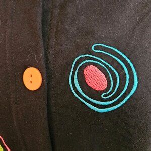 tags: boho, bohemian, cottagecore, retro, Y2K, vintage, career, professional, work wear, career wear, business casual, teacher, fun top, fun jacket, embroidered jacket, multicolored jacket, black cardigan, vintage look, retro,