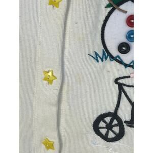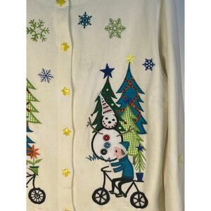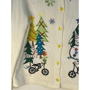 Onque Casuals Ugly Christmas Cardigan Sweater Medium Embroidered Snowman. There are some faint stains near the buttons on the belly and a dime size faint stain on the left shoulder.