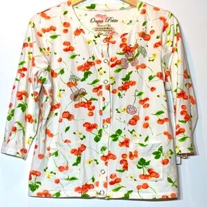 Onque Casuals White Rhinestone Cherry Print Snap Button Cardigan