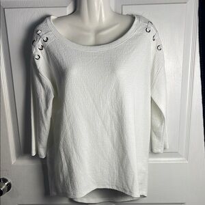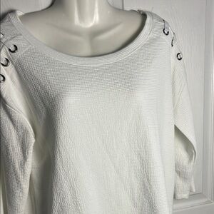 Chic white blouse with stylish lace-up shoulders. Textured fabric adds a modern touch. Ideal for casual elegance.