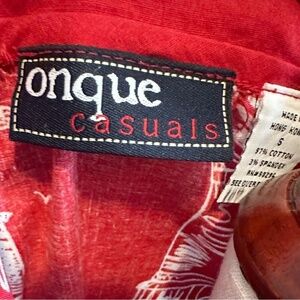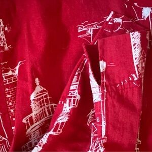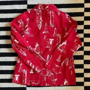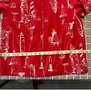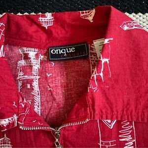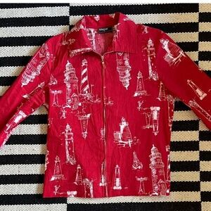 Cotton zip jacket by Onque. Says size small, but fits M and L as well. Model is a Large. Fabric is stretchy. Metal zipper. Red and white vintage lighthouse pattern.