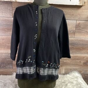 Onque Casuals Ladies Black Cardigan, Size Small, Embroidered Musical Notes, Black and White Plaid Trim,Vintage