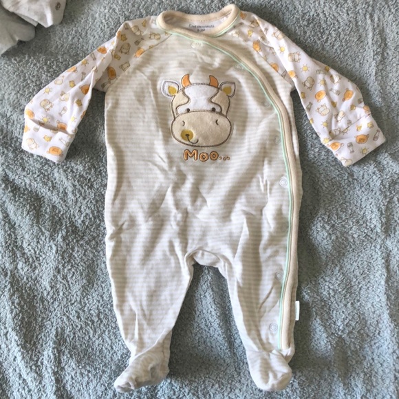 First moments cow onsie with feet and fold over mittens 0-3 months