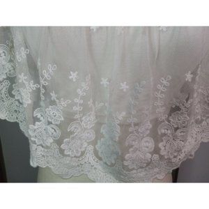 Round neck. Wear on or off shoulders. Lace shell. Cotton/Nylon shell material. Rayon/Spandex lining. Chest 30" unstretched.