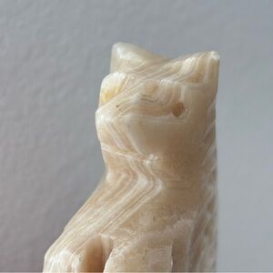 The figurine is made from onyx, a type of banded calcite. The stone's natural layers and colors, which can include shades of beige, cream, brown, and tan, are visible in the carving.