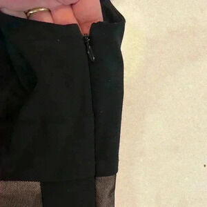 Onyx Noir Womens Formal Dress Black 14 Sheer Mesh Overlaying Cream Base w/Black Stripes Throughout Fitted Silhouette Pleated Bodice Stretchy. Vintage 1990’s Glam Avant Garde Whimsygoth EUC