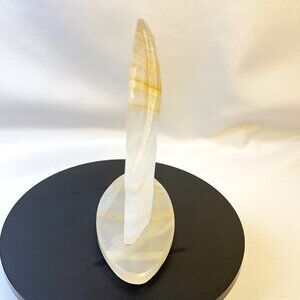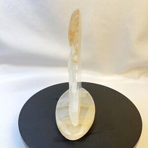 This amazing onyx or marble sculpture captures the serene profile of Jesus Christ in a hand-carved bust that blends spiritual reverence with the natural elegance of banded stone — a timeless piece for collectors and believers alike. The face of Jesus, full of grace, gazes upward in this tabletop sculpture. The sculpture is smooth on the backside and rests on an elliptical marble base.