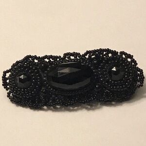 Stunning vintage brooch! Measures 2 inches long and a little more than .5 inches wide. Three Beautiful onyx beads set with black beads around. Backing is fabric and 925 marked silver.