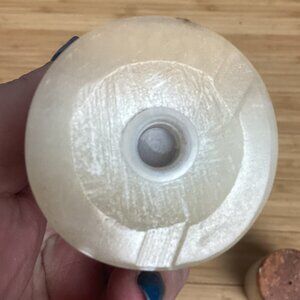 Beautiful set, made with Onyx (or Onix) and marble tops. Cream and tan colors. Bottom stopper to fill. Good used condition.