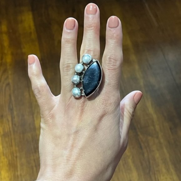 The ring is bound by silver with onyx and mother of pearl. It's also adjustable in the back for flexibility on sizes. Hand featured is a size 6 ring size.