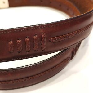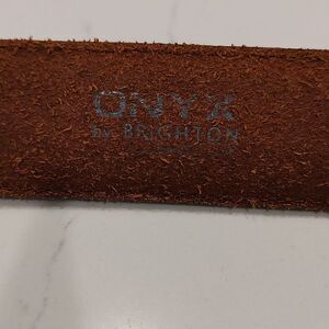 Vintage Onyx by Brighton Brown Leather Men's Belt with a Silver Buckle, Loop and Tip. This belt features a braided design and reinforced holes. 100% leather. Size 38.