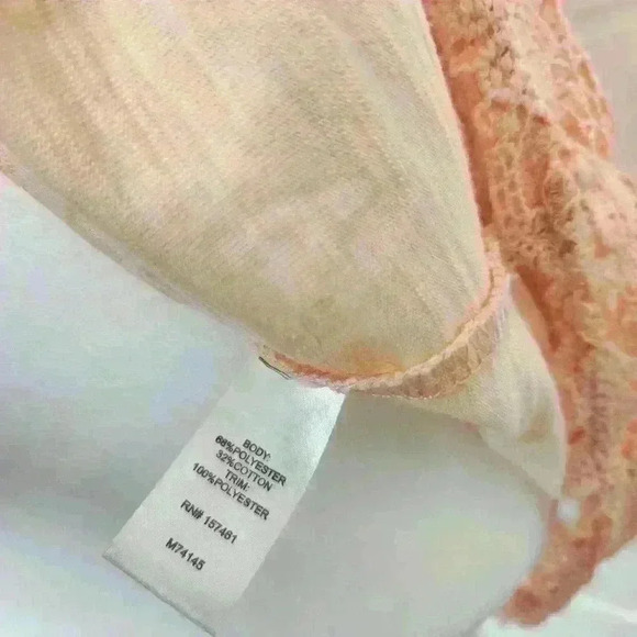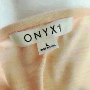 Onyx moda women's light pink lace trim blouse size large. Lace over shoulders and on hem line. Lightweight. Very pretty. A bit sheer, will need undershirt. In excellent pre-owned condition. No flaws. Measurements are approximate and taken flat.