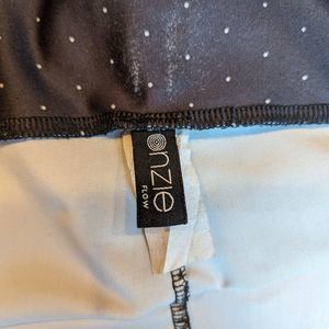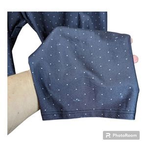 Onzie Flow leggings in crop length. Black with white polka dots. In well loved condition; see pictures for detail of scuffed spot on left thigh and some white spots near left cuff. See pictures also for care, material, and measurements.