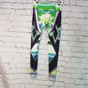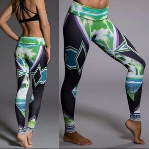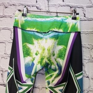 Onzie Palm Sunset printed leggings Size s/m Bin 26 Waist flat 12 x 2 Rise 9 Inseam.28 Length 37