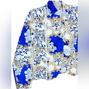 Chic floral blazer with vibrant blue and gold design. Perfect for stylish occasions. Add flair to your outfit.