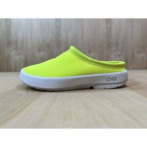 Gently used condition of mens Oofos Oocozie sport mule size 9 men. Bright electro green color with white. Lord of tread left.