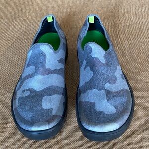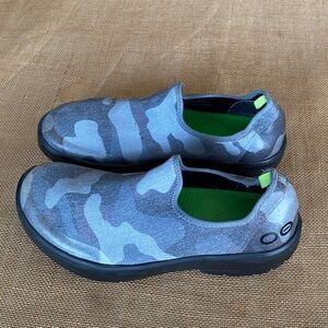 Oofos Oomg Eezee low canvas slip on gray camo recovery shoes