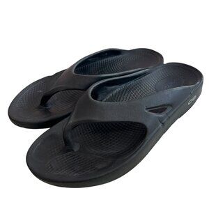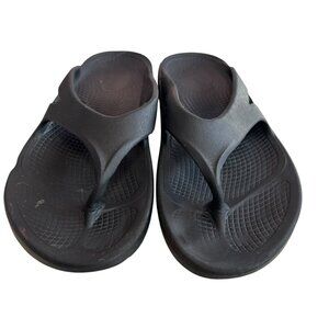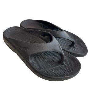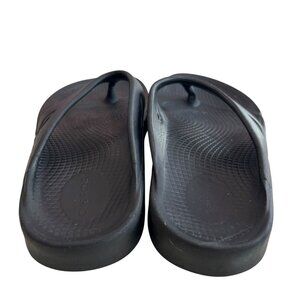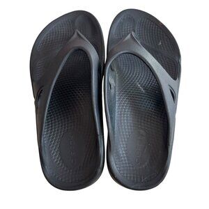 Oofos Ooriginal sandals, solid black, super lightweight, cushioned, very comfortable, slip on thong style, womens size 7, preowned and shows wear on the soles and heels, dents, wear on the footbed - see photos