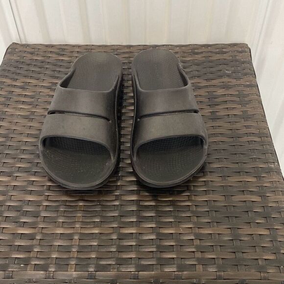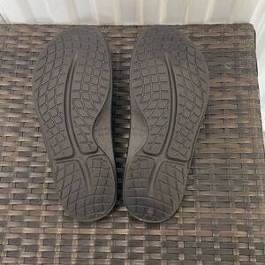 Oofos mens sandals size 11 women’s size 13 in good pre owned condition normal wear and tear the color is black show signs of where on the inside soul show signs of wear on the bottom of the shoes overall and great shape