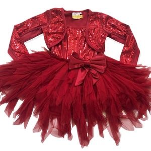The color is a deep red (not burgundy yet not bright red). The dress has adjustable spaghetti straps and a tulle skirt with rows of vertical tulle. The front has red sequins and fixed attached bow. The matching red sequin shrug has knit back and underneath side of sleeves.
