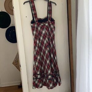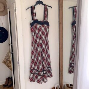 Vintage plaid dress with red/yellow/green/blue/white with gray corduroy piping size 3/4 fits like a small (4) body does have pockets bust 16inches waist 21inches