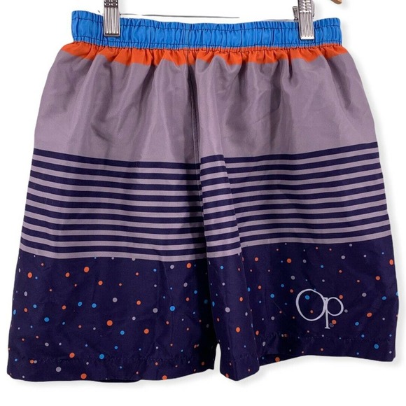 Op stripe dot swim trunk large. Pull on swim trunk Built in brief Elastic waist Very good preowned condition Waist 12.5" Inseam 5"