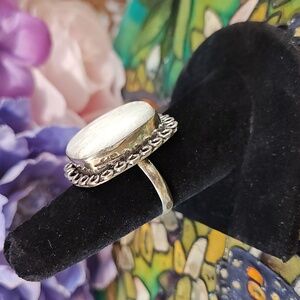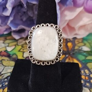 This is a beautiful square shaped Opal ring. This whitish Opal is also known as Hyalite Opal. Opal is believed to enhance creativity and originality. It encourages honesty and self-expression. It is considered a protective stone that absorbs negative energy and reflects it back to the source. When placed on the heart area it is said to release emotional blocks and allow for truer, deeper love connections. It can be worn, carried, or placed in the home. Wear this stunning ring and get lots of compliments!