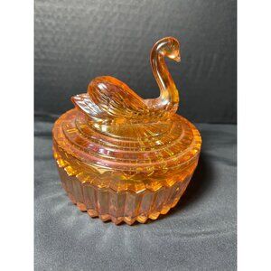 Opalescent Jeanette Glass Swan Covered Candy Powder Dish. Elegant carnival glass design, perfect for vintage décor enthusiasts or collectors. Measures 5 inches in height.