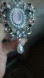 Ornate filigree silver tone with opalescent pink cabochon center surrounded by tiny faux Pearls. Black and opalescent pink and faux Pearl Stones throughout with a faux Pearl dangle.