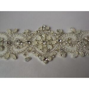 A stunning opalescent beaded bridal belt. It is 43 inches long and 2 inches wide. It has a plastic snap closure. Very heavy beading.