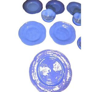 Gorgeous opaline or opalescent blue plates and bowls reminiscent of Murano with a lovely 5 petal pattern that just glisten when held up to the light. Not the traditional opaline blue because these are a bit darker but not quite cobalt blue. I would say a cross between the two. 4 salad 6 in plates, 4 saucers 4 in , 3 bowls and one dinner plate , 10 inches , for a great price compared to most Murano or Opaline. Free shipping